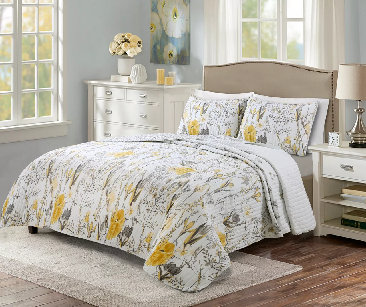 An elegant floral print in yellow, gray and white hues brings a touch of garden elegance to your sleep space, while the breathable cotton construction keeps you cozy and comfy through the night.