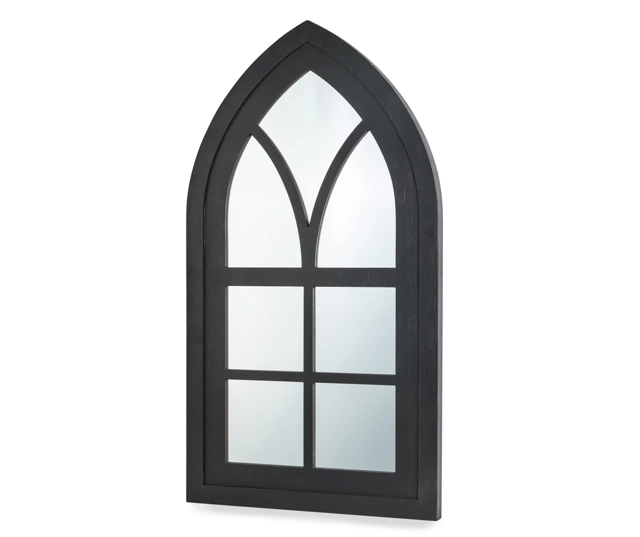 Flaunting a pointed arch frame with windowpane detailing in the center, this decorative mirror refreshes your room with modern architectural style that makes a statement, while providing a feeling of extra space and depth. Hook loops in the back make installation quick and easy.