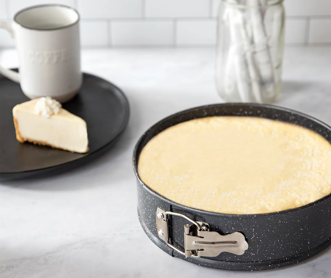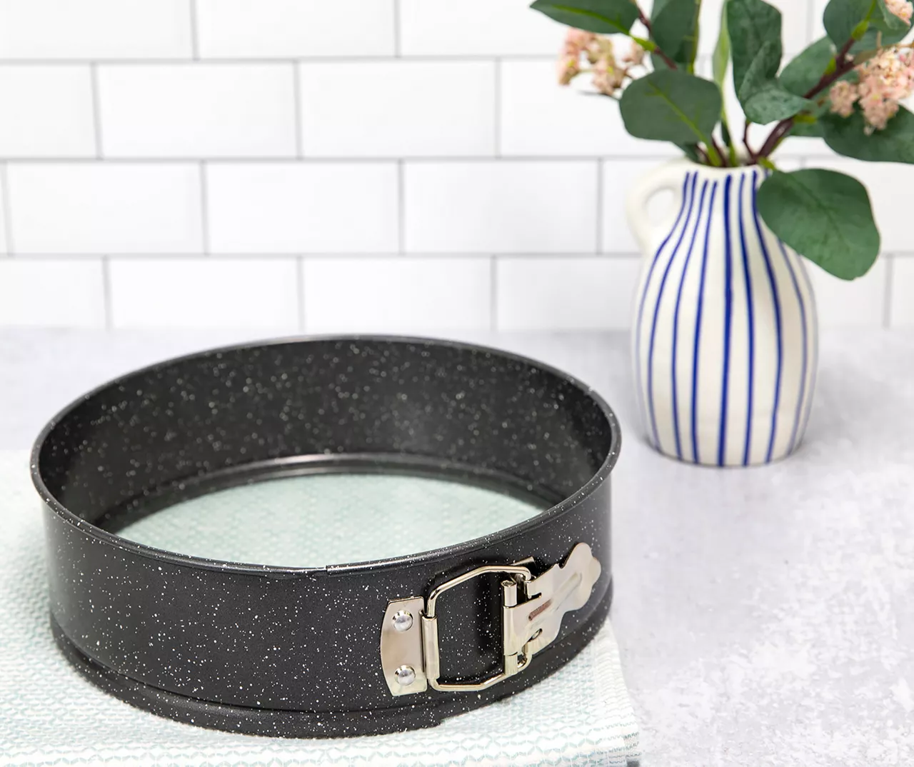 Bake the treats of your dreams with this stylish springform pan. The buckle provides a smooth release so your creation’s sides stays perfectly in form. Complete with a fashion forward look in black and a white speckled pattern, the springform’s non-stick finish ensures easy baking and cooking.
