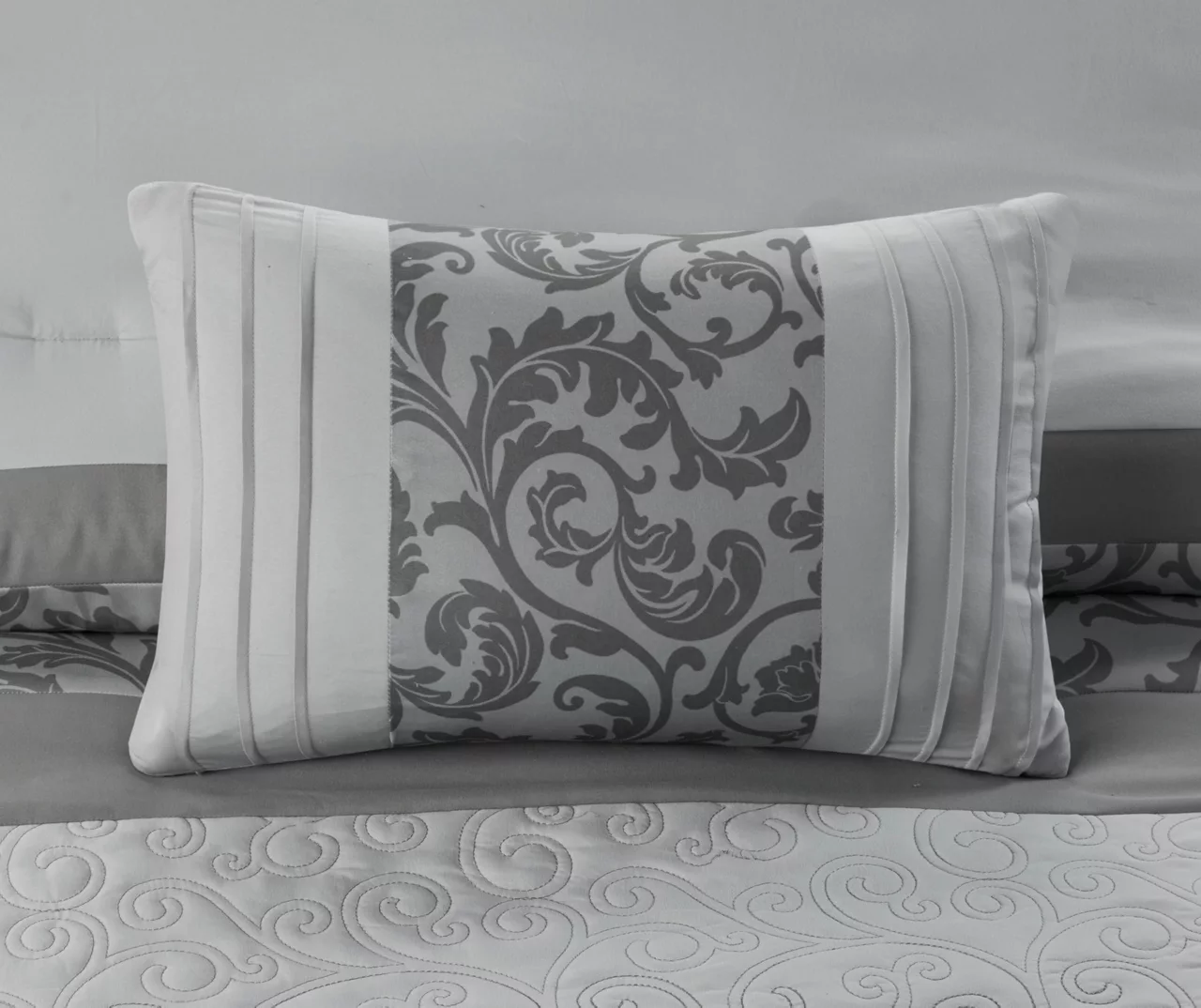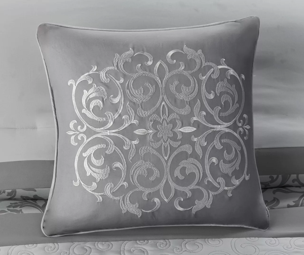 The Casey embroidered eight-piece comforter set introduces a graceful elegance to your bedroom decor. A pieced embroidery design with quilting and pintuck details adorns the face of the comforter and shams for a beautiful transitional look. Solid euro shams complement the top of the bed, while two embroidered decorative pillows and a solid bed skirt provide the perfect finishing touches. Made from ultra-soft microfiber, this comforter set is machine washable and offers a charming update to transform your bedroom.