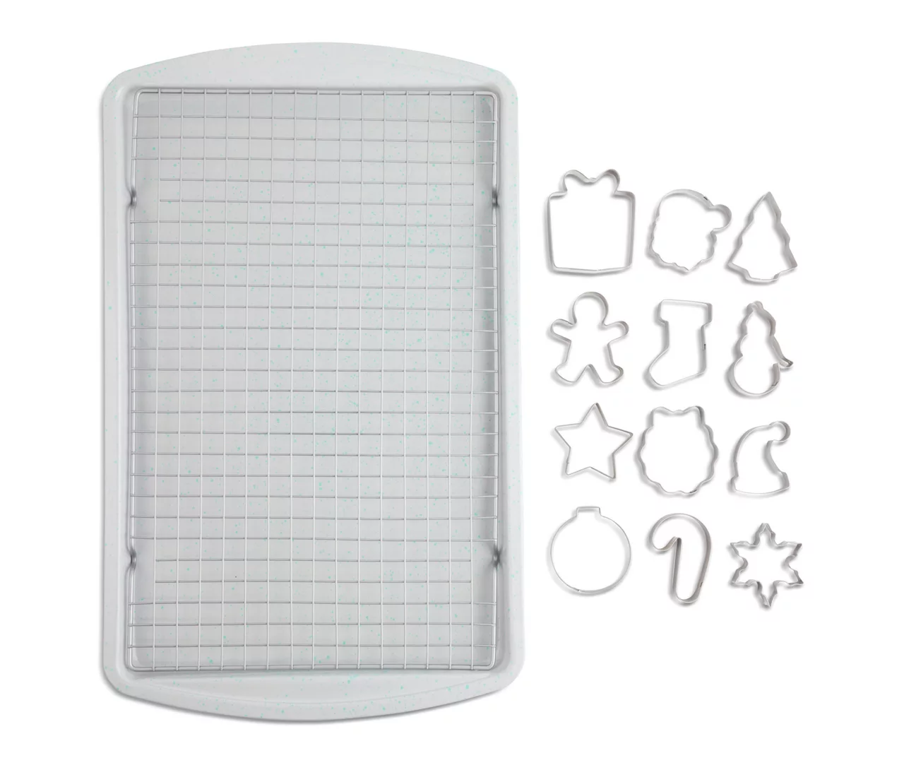 - Includes 12″x20″ baking pan, 10.5″x16.5″ wire cooling rack and 12 mini cookie cutters