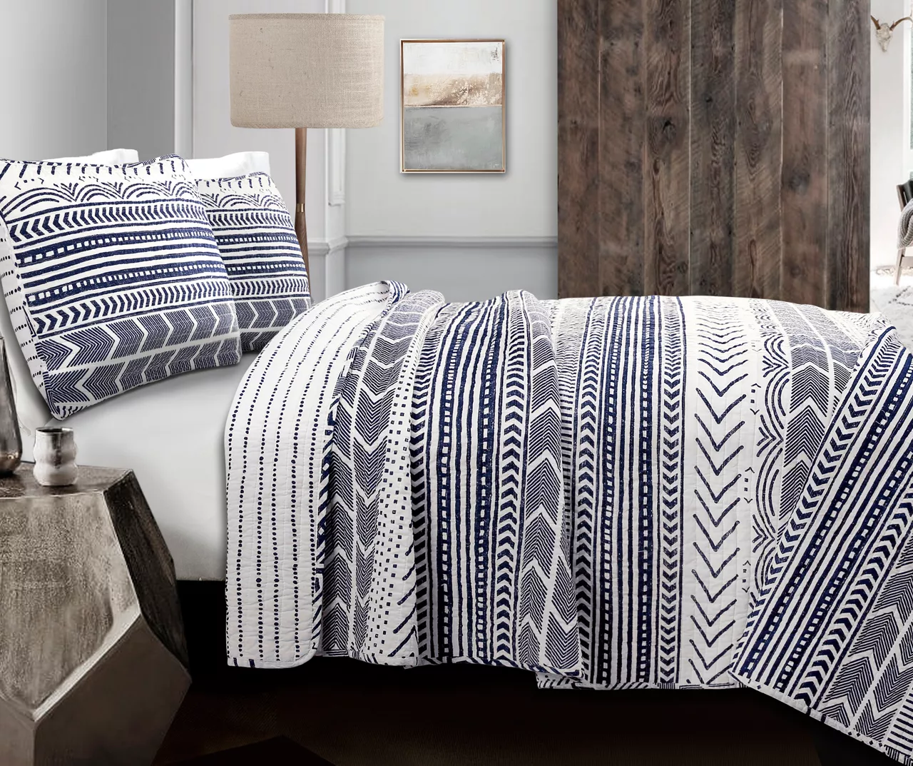 Style your sleep space with the free-spirited vibes of this cozy quilt set featuring rows of geometric designs in navy and white hues. Matching shams complete the look for a quick and simple bedroom makeover.
