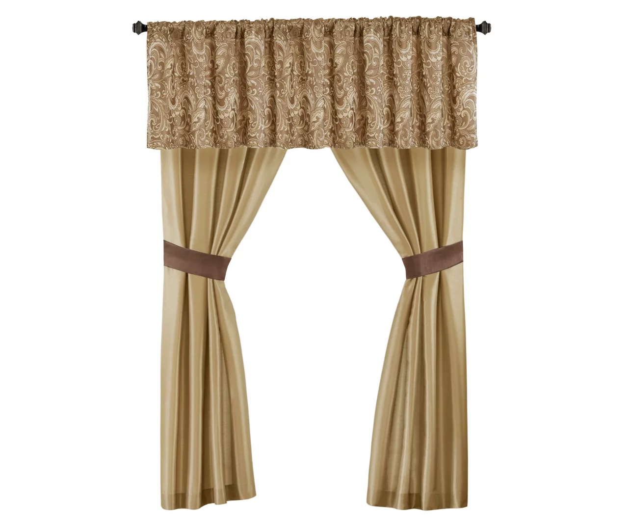 Update your entire room in an instant with this 24-piece bedroom-in-a-bag set from the Isabella collection. An intricate paisley design in a brown and tan palette lends a sophisticated, traditional look to a master or guest bedroom complemented by four window panels, two valances and matching tiebacks. Four decorative pillows use embroidery and pintuck details to create the perfect finishing touches to the top of bed.