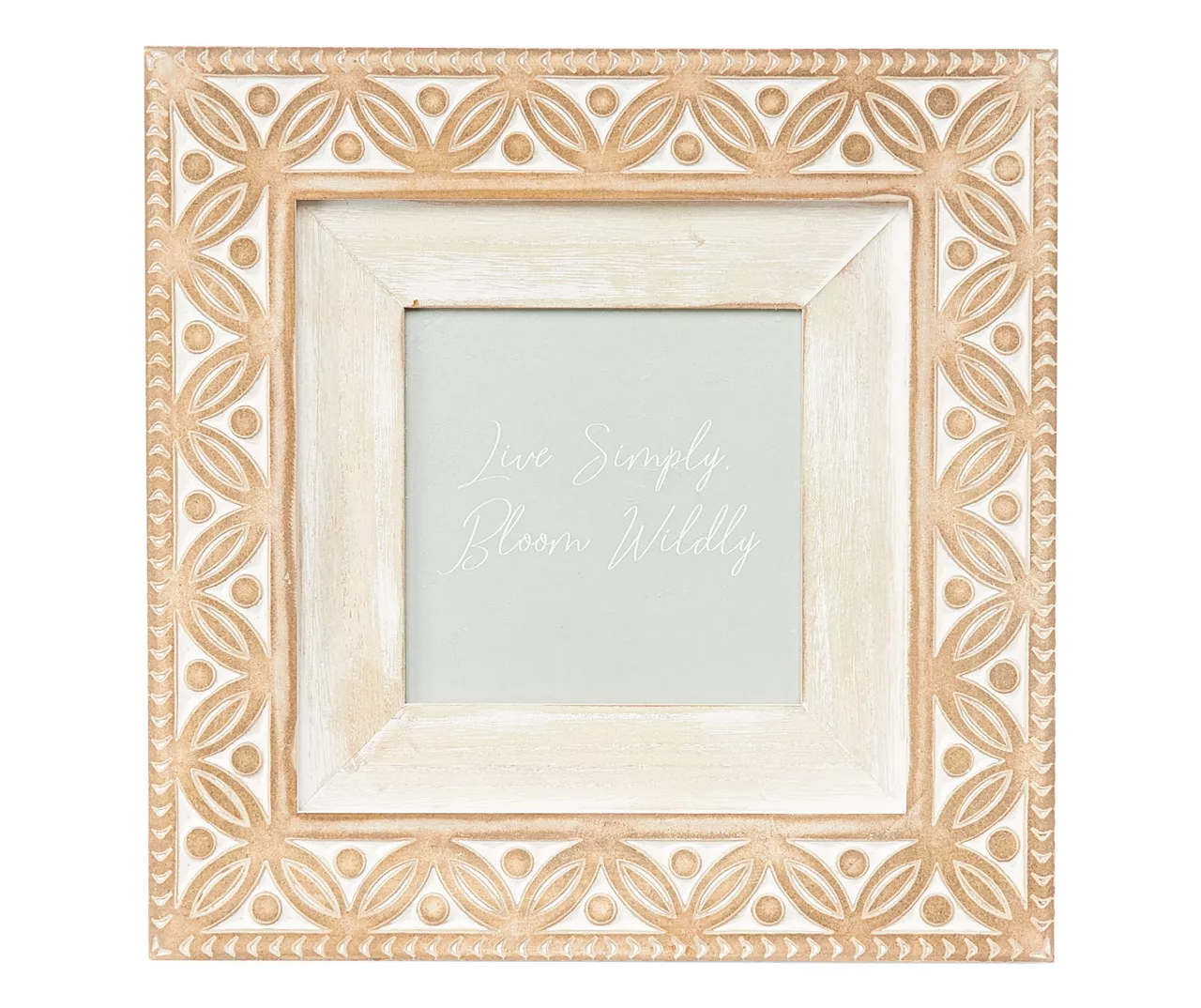 - “Live simply, bloom wildly” messaging in white script font on a light green background