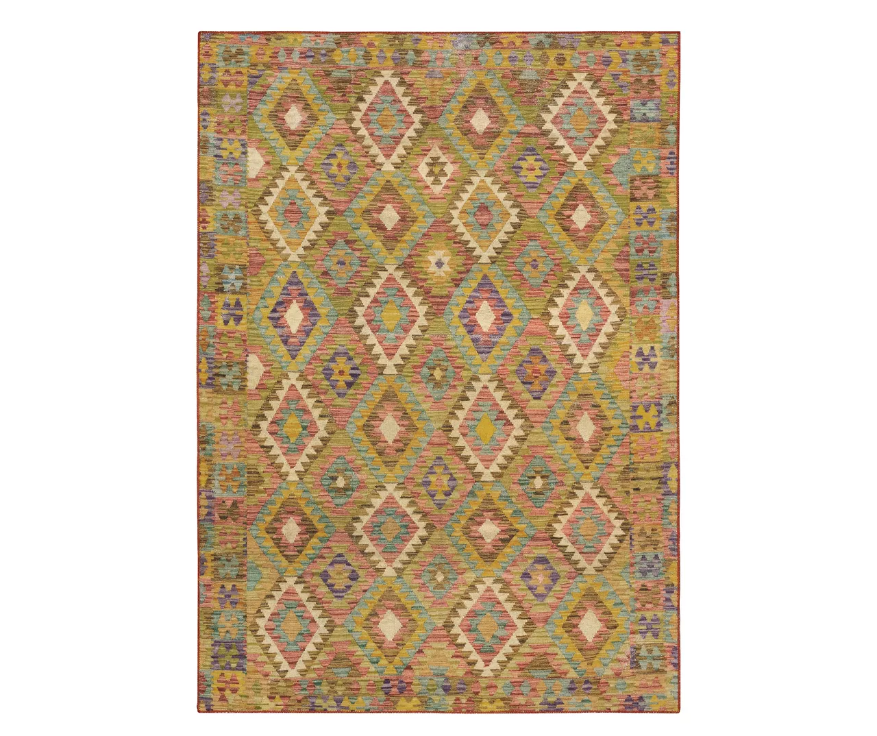 The Maclo collection, machine-made from soft polyester, features an innovative printed base with non-slip backing that is perfect for high-traffic areas and family living spaces. With its low pile and intricate blanket stitch finish, this rug showcases a geometric design inspired by American Southwest style in dark gold, red, teal, green and brown hues that effortlessly complements any room in your home.