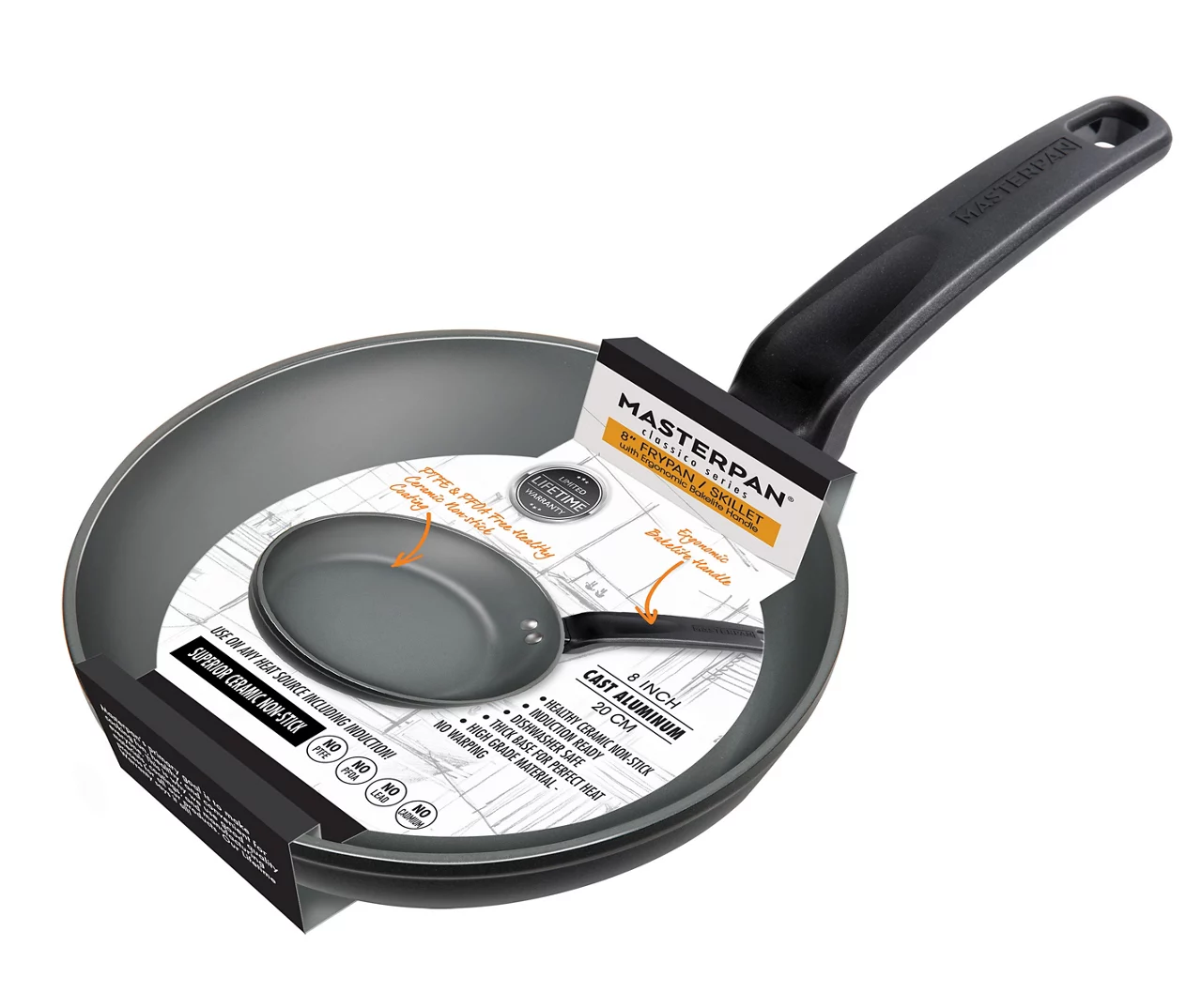 The Masterpan Fry Pan & Skillet is a must have for any kitchen and is crafted from cast aluminum with a bakelite handle, and then finished with a premium non-stick coating. It has deep 1.75” sides that reduces easy spillage and splatter when frying, making it the ideal pan for stir frys, crepes, pancakes, eggs, quesadillas and much more. The sleek style and ultra durability fulfills all your cooking desires. Part of our Classico Series, the pan boasts a streamlined look and bakelite handle making it an ideal addition to any kitchen and your cooking needs. Cookware that is guaranteed to perform as amazing as it looks!