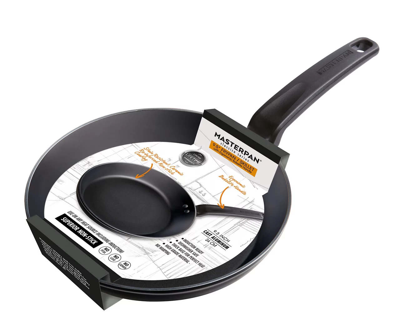 The Masterpan Fry Pan & Skillet is a must have for any kitchen and is crafted from cast aluminum with a bakelite handle, and then finished with a premium ceramic reinforced non-stick coating. It has deep 1.75” sides that reduces easy spillage and splatter when frying, making it the ideal pan for stir frys, crepes, pancakes, eggs, quesadillas and much more. The sleek style and ultra durability fulfills all your cooking desires. Part of our Classico Series, the pan boasts a streamlined look and bakelite handle making it an ideal addition to any kitchen and your cooking needs. Cookware that is guaranteed to perform as amazing as it looks!