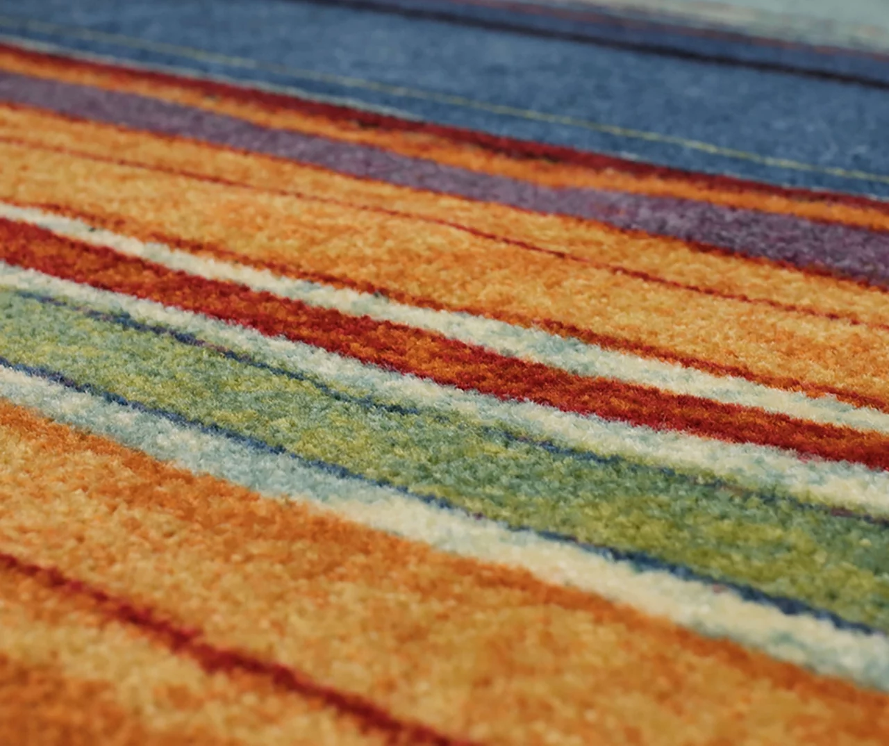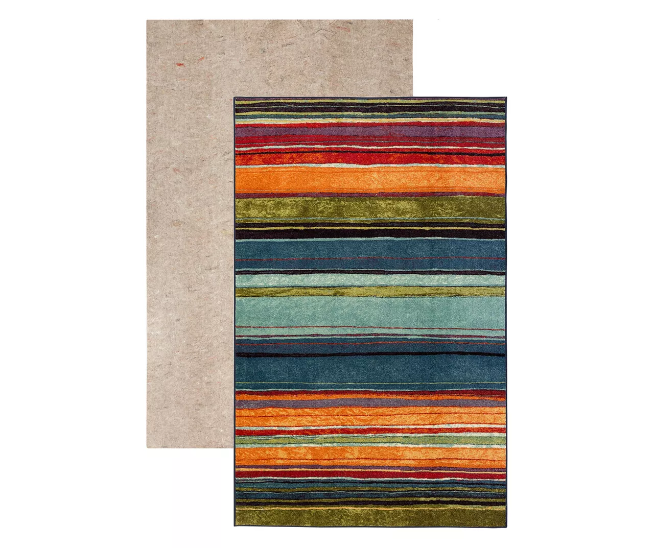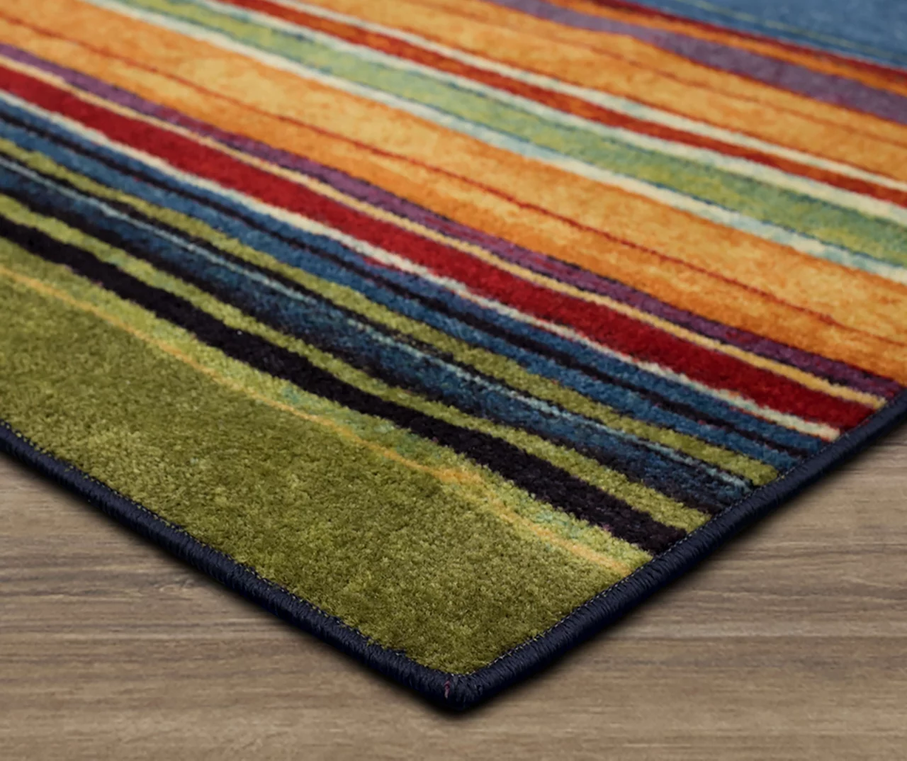 Saturated shades of blue, green, red, orange, yellow and purple form stripes across this lovely area rug from Mohawk Home. This transitional style features modern brushstroke-inspired stripes in bold contemporary color. It’s a beautiful addition for dining areas, kids spaces, bedrooms and more and it’s resistant to staining for improved durability in high-traffic areas.