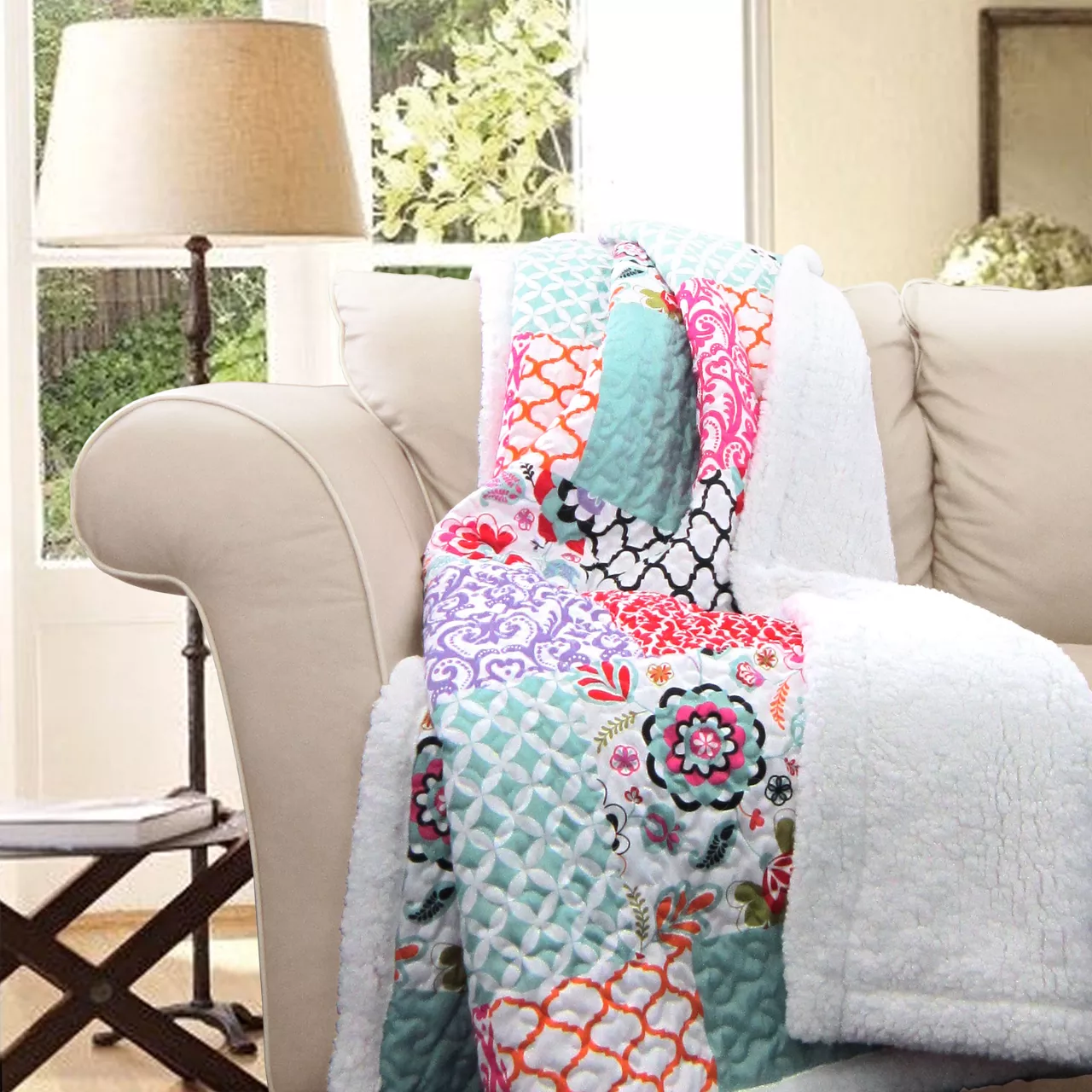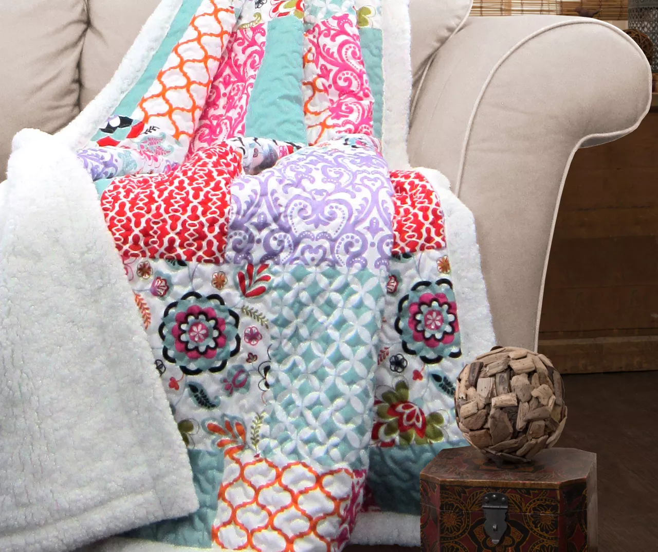 Geometric and damask prints define each patchwork section of this throw for a colorful bohemian accent in your living space. Soft sherpa fabric lines the edges and reverse side for cozy comfort on cool days and nights.