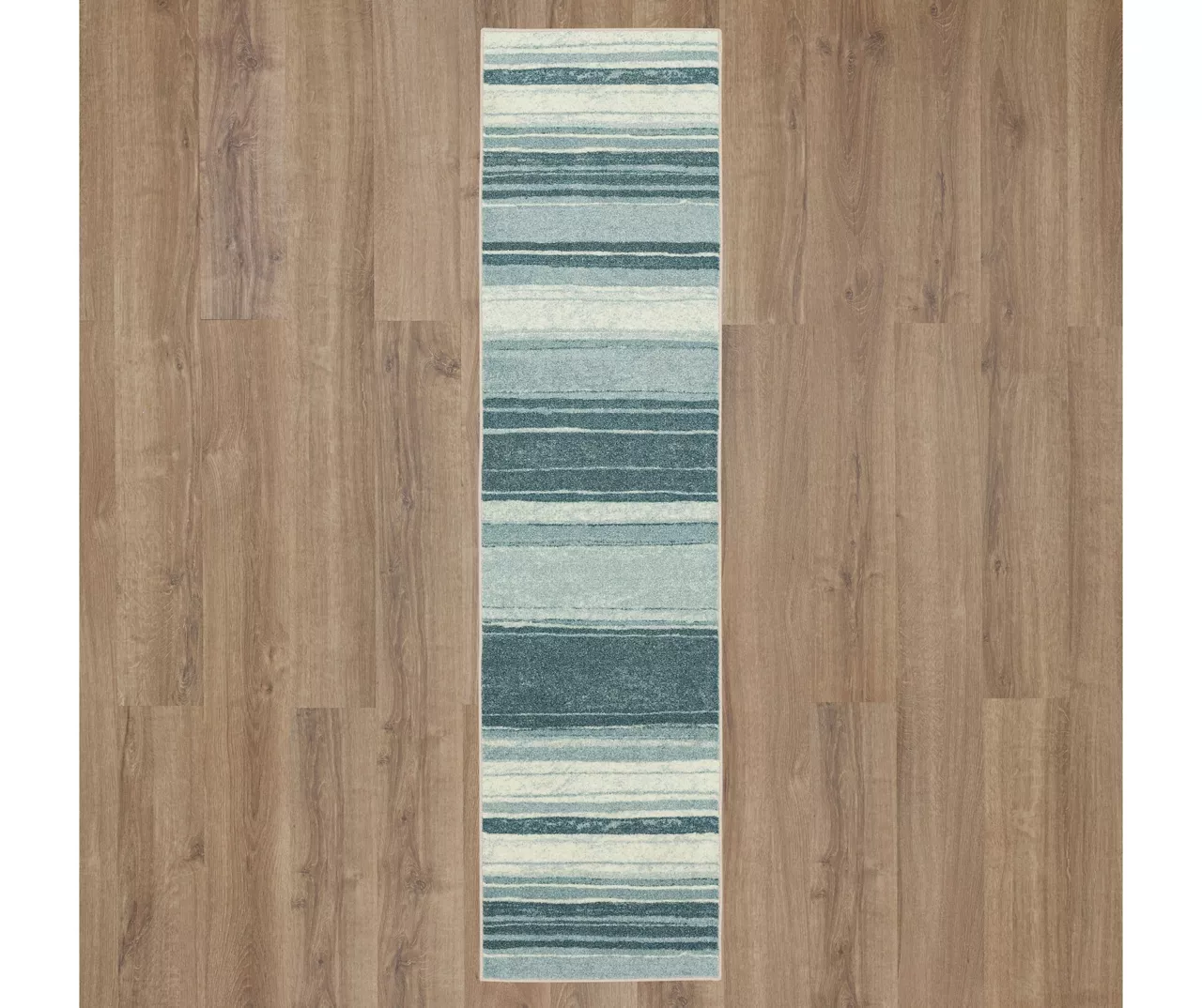 Bold saturated stripes in versatile blue shades adorn the Mohawk Home Rainbow runner rug. Showcasing modern brushstroke lines, the azure palette featured on the pattern of this contemporary area rug effortlessly complements your space to create a look that is truly all your own. This rug features bold color clarity and richly defined details with the dependable durability needed for busy households. The dense pile is created with a premium recycled polyester yarn that provides proven stain resistance, while the latex backing helps to secure this rug in place.