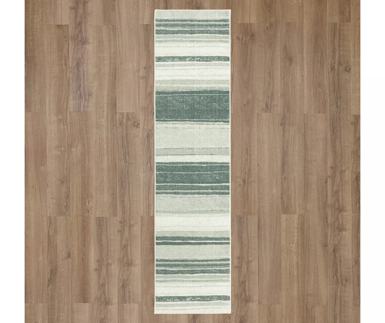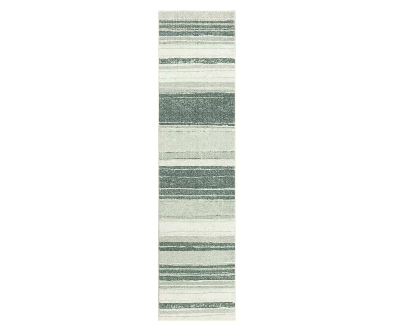 Bold saturated stripes in versatile gray shades adorn the Mohawk Home Rainbow runner rug. Showcasing modern brushstroke lines, the neutral palette featured on the pattern of this contemporary area rug effortlessly complements your space to create a look that is truly all your own. This rug features bold color clarity and richly defined details with the dependable durability needed for busy households. The dense pile is created with a premium recycled polyester yarn that provides proven stain resistance, while the latex backing helps to secure this rug in place.