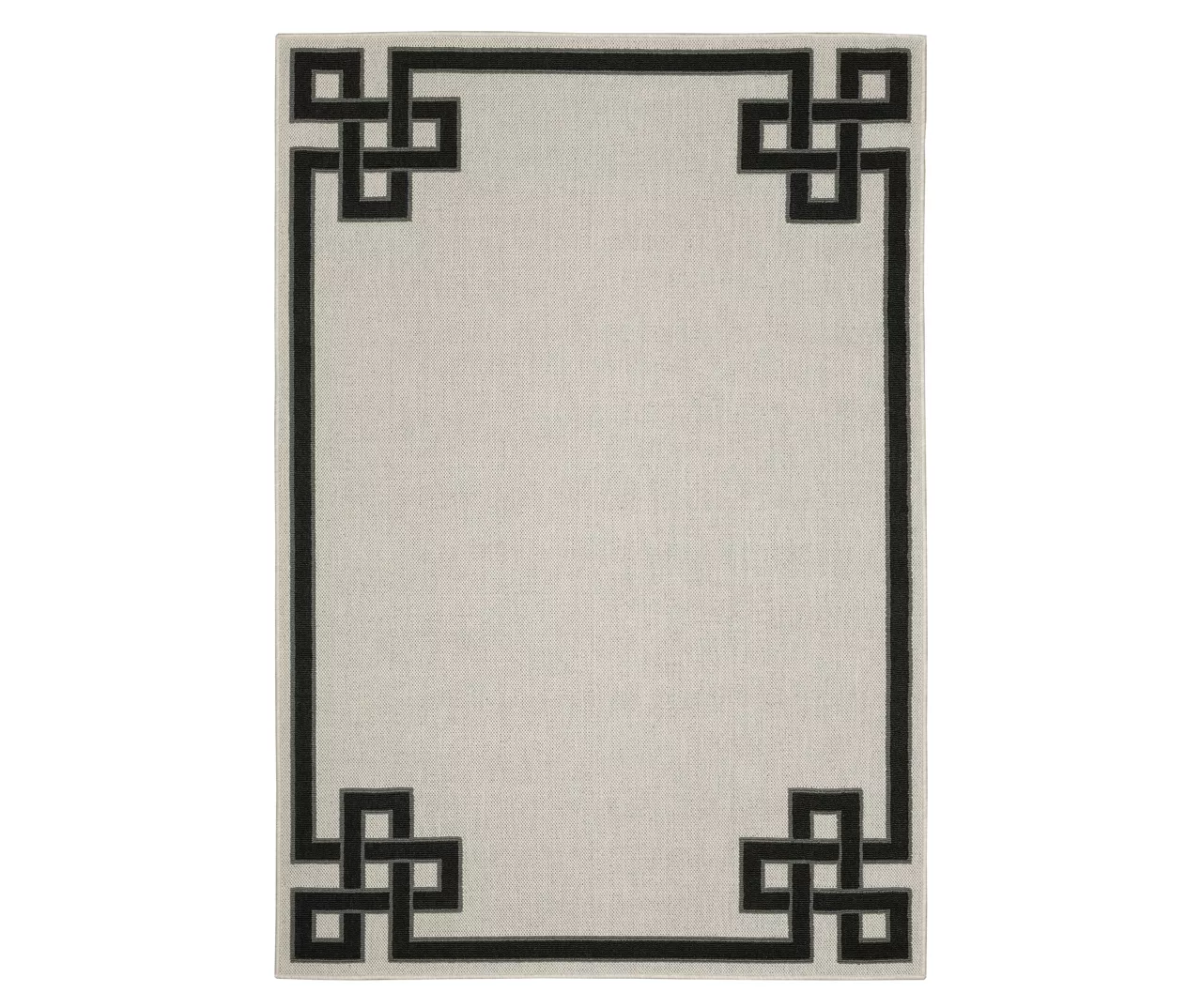The unique power-loomed construction of the Torbet collection features both flatwoven and loop piles, giving the rug a soft, textured feel underfoot that’s durable enough to enjoy both indoors and outdoors. The cozy fibers are defined by a looping border design in bold shades of black and beige for a modern decorative complement that easily fits into your living and patio spaces.