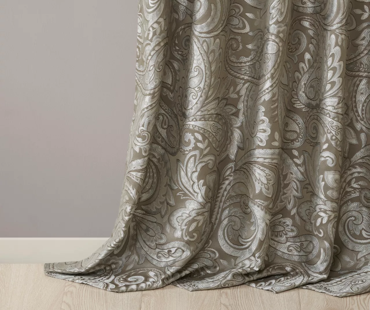For a luxuriously classic style, the Valerie curtain panel pair is the perfect touch to your decor. The alluring jacquard weave is inspired from an updated paisley motif and is woven in beautiful hues of blue, taupe and a hint of platinum for a shimmering accent. The window panels are pieced with solid faux silk and beautiful flat piping details in gold, creating an elegant look. Simply hang on rod pocket or back tabs for a tailored finish.