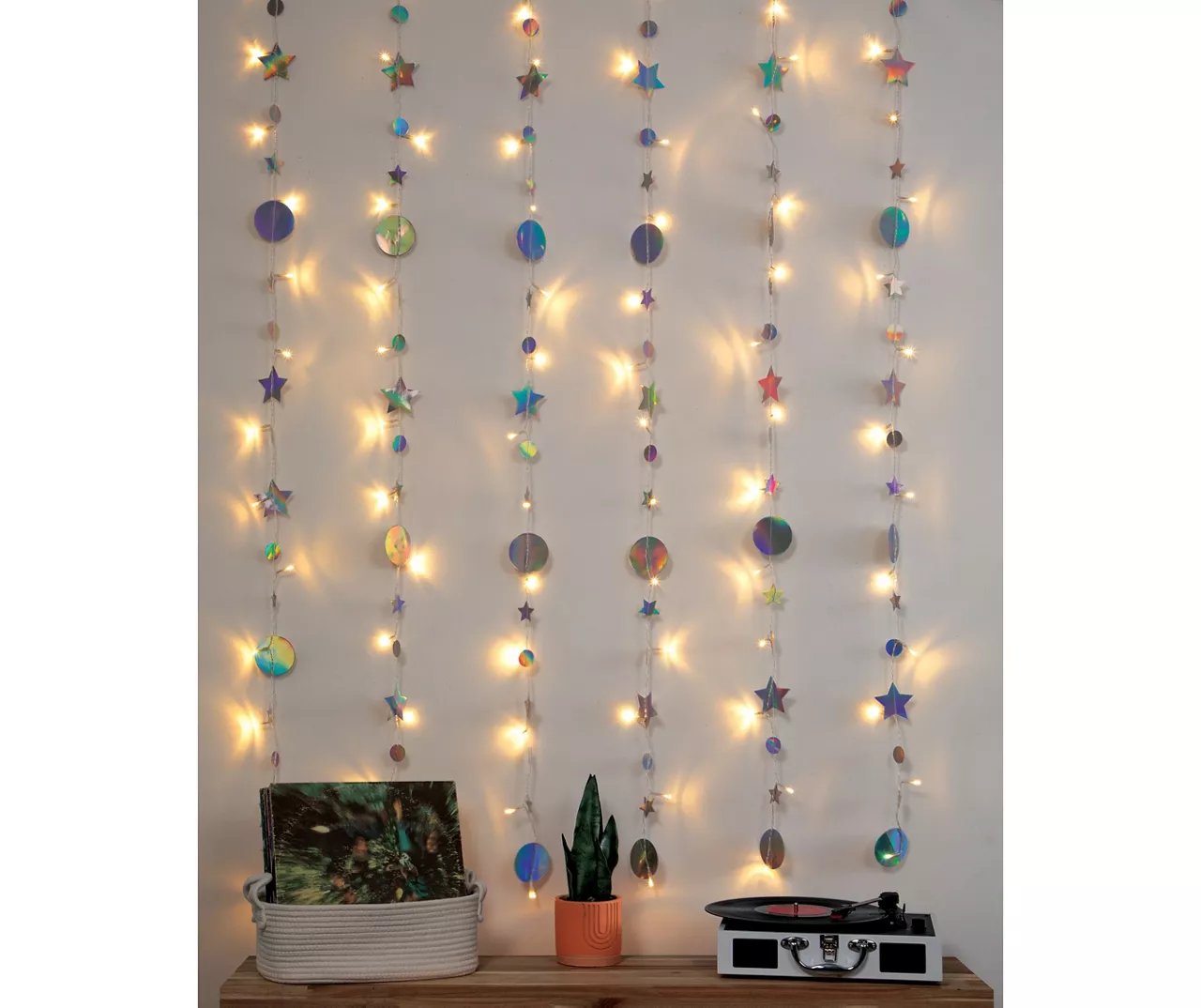 Create a whimsical and warm living space with the addition of these celestial battery-powered LED curtain lights featuring colorful moon and star shapes arranged with white LED lights.