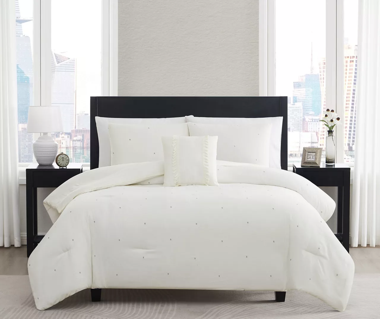 - Embroidered lines on the comforter create a subtle tufted look