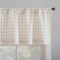 Crest White & Blue Dash Grid Light-Filtering Rod Pocket Tier & Valance Curtain Set, (36″ X 58″)